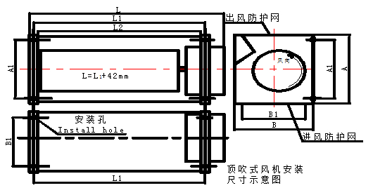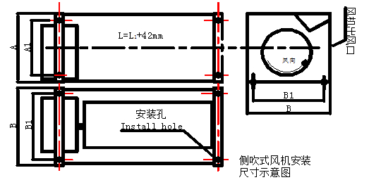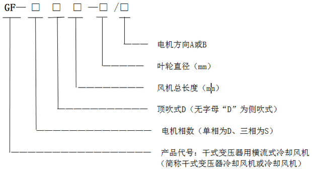 冷卻風機A、B區分:以產品銘牌方向電機安裝在左側為B型,右側為A型。實例一:GFDD470-150 A 表示:干式變壓器橫流式冷卻風機、單相220V、頂吹式、風機總長度470mm、葉輪直徑150mm、電機在右邊;